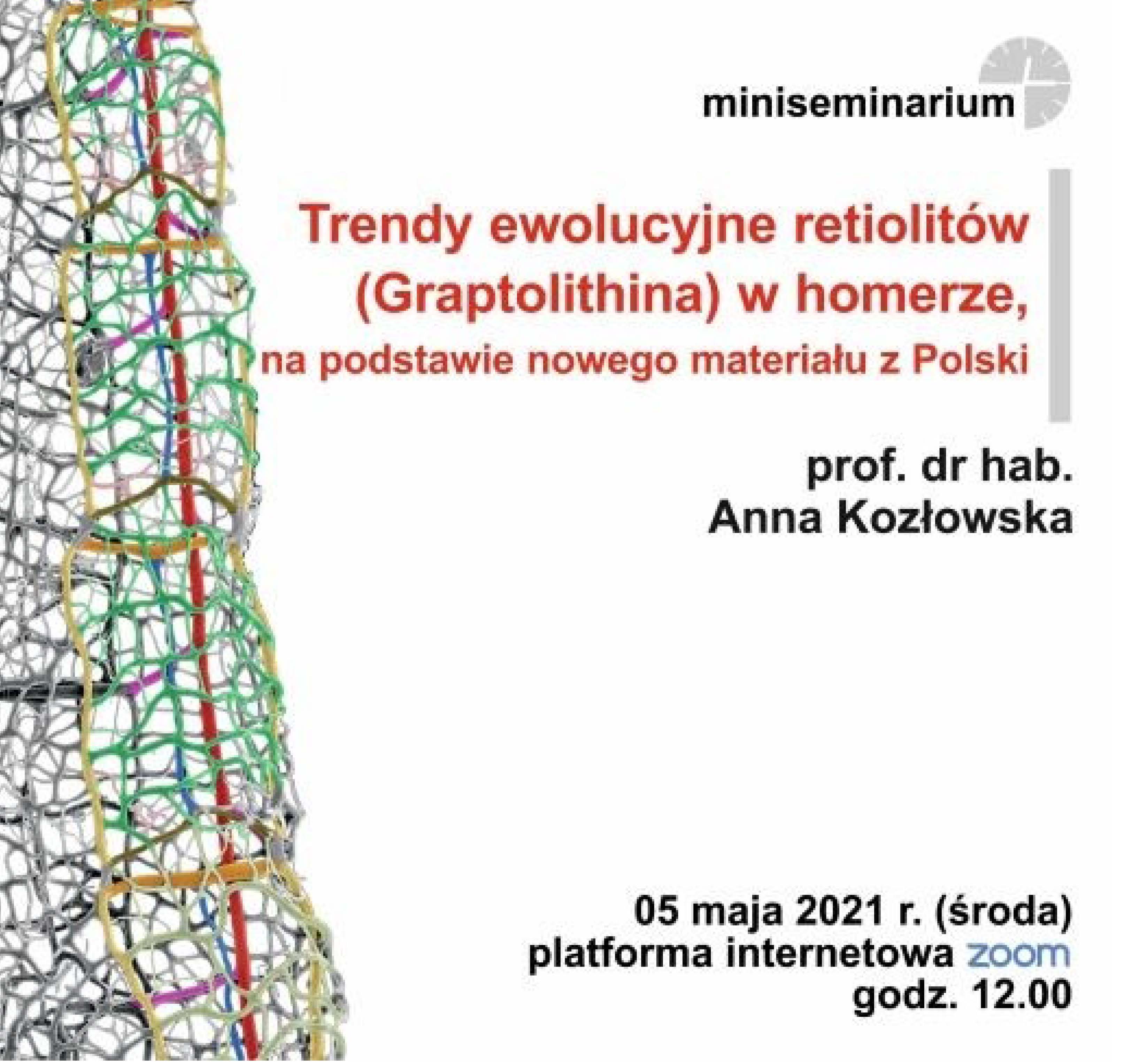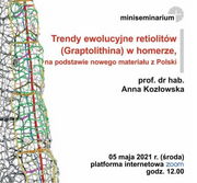 5 maja 2021 (środa), o godz. 12:00, na platformie internetowej zoom prof. dr hab. Anna Kozłowska wygłosi referat: "Trendy ewolucyjne retiolitów (Graptolithina) w homerze, na podstawie nowego materiału z Polski."