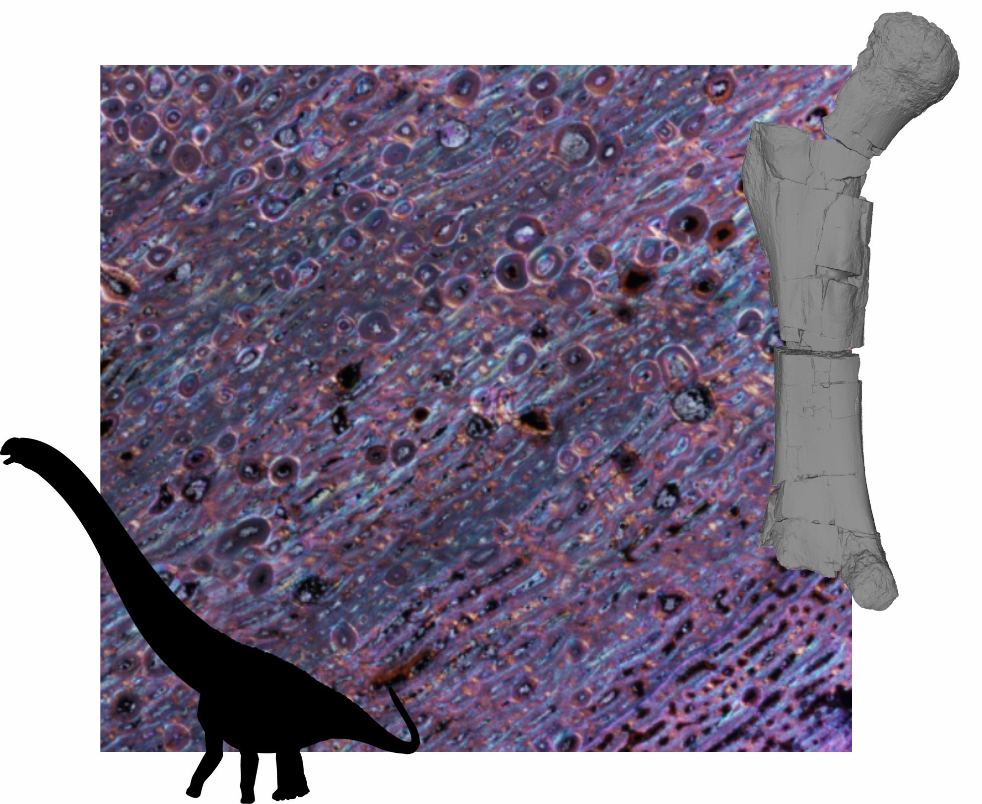 Rycina: Model 3D badanej kości udowej, schematyczna rekonstrukcja ciała reprezentanta tytanozauriformów (Phylopic, autor: Tasman Dixon) oraz fragment przekroju przez kość udową pokazujący osteony wtórne rozsiane w zmodyfikowanej kości laminarnej.