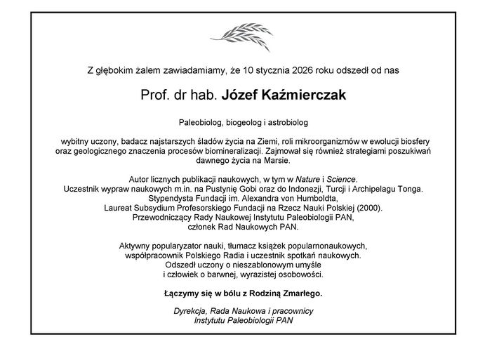 Z ogromnym smutkiem żegnamy profesora Józefa Kaźmierczaka, wieloletniego pracownika Instytutu Paleobiologii PAN, wybitnego uczonego o wszechstronnych zainteresowaniach. Człowieka o barwnej i wyrazistej osobowości. Na prośbę Rodziny informujemy, że ceremonia pogrzebowa będzie miała charakter prywatny.