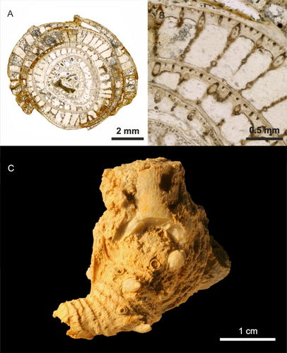 Figure: Rhizocaulon huberi. The bottom image (C) shows the silicified rhizome physically connected with the pseudostem. The top left image (A) shows a transverse section of the pseudostem, and the top right one (B) its enlargment, showing the anatomy of leaves forming the pseudostem.