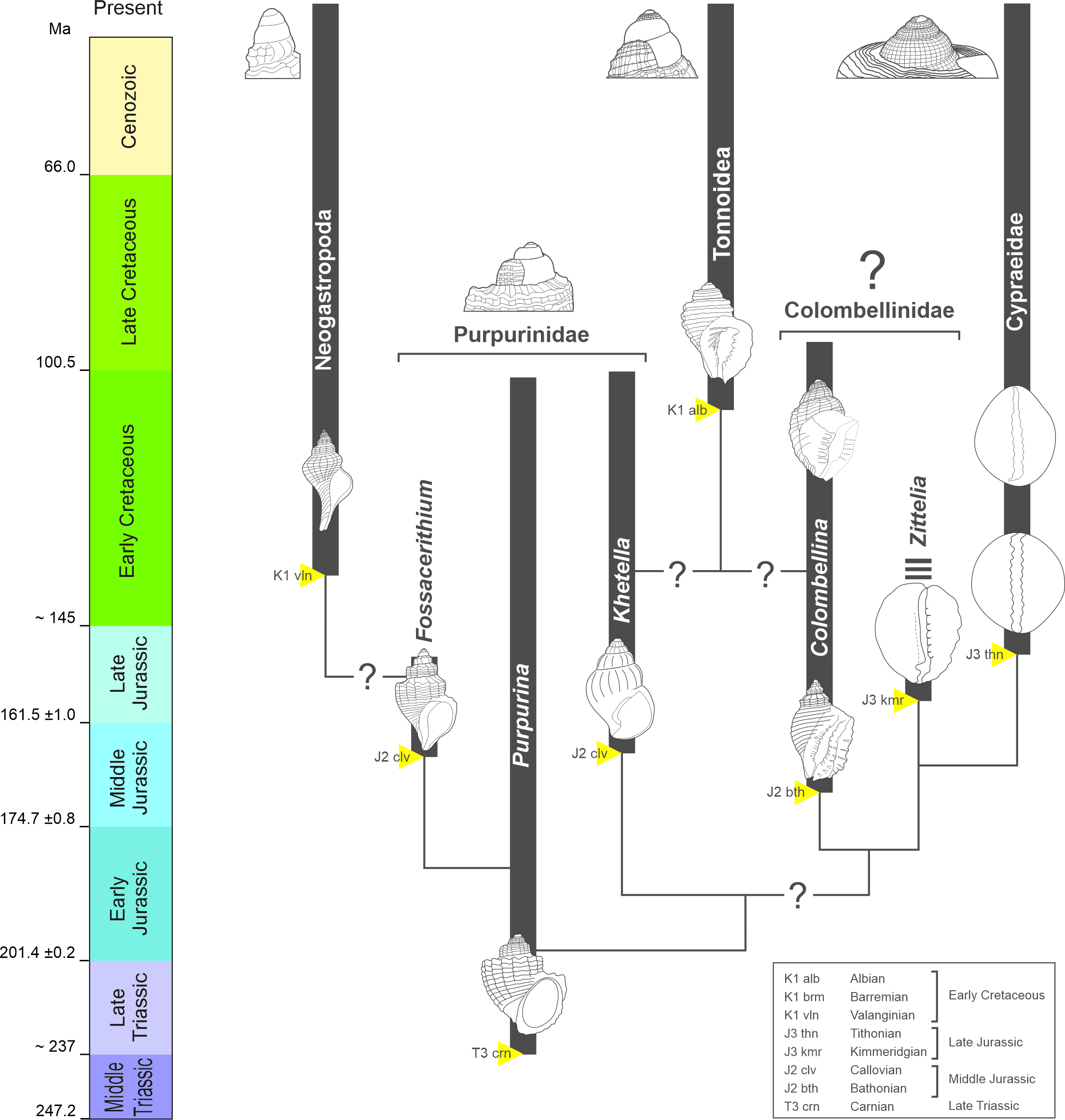 Colombellinidae was a family of small marine snails that inhabited warm shallow seas during the Jurassic and earliest Cretaceous. This extinct group was revised based on all known fossils. The family included only two genera. Additionally, a new species from Bulgaria was described. Colombellinid shells share some features with modern cowries, suggesting that they may represent an early branch in the evolution of these well-known marine snails, but they may also be related to predatory sea snails such as tritons and tun shells.