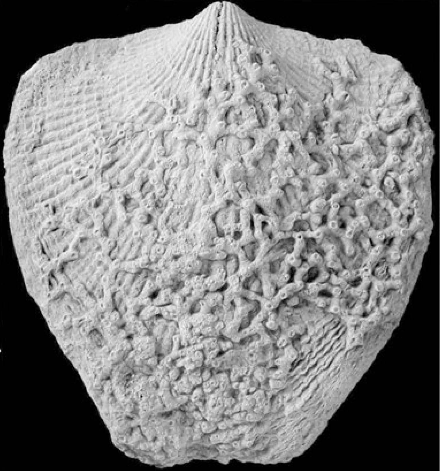 Figure: Kyrtatrypa pauli: ventral valve of the brachiopod overgrown by auloporid tabulate corals (Laskowa, Givetian; leg. G. Racki, photo A. Baliński; cf. Halamski et al., 2024, fig. 5M)
