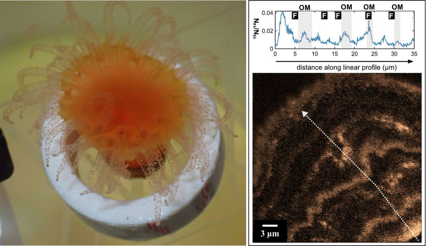 Figure: Cold-water, non-symbiotic coral Balanophyllia elegans (left) and the relationship between successive feeding pulses (letter F on the graph) and skeleton formation along with the incorporation of organic matter (OM), visualized by NanoSIMS mapping of the skeleton (bottom right).