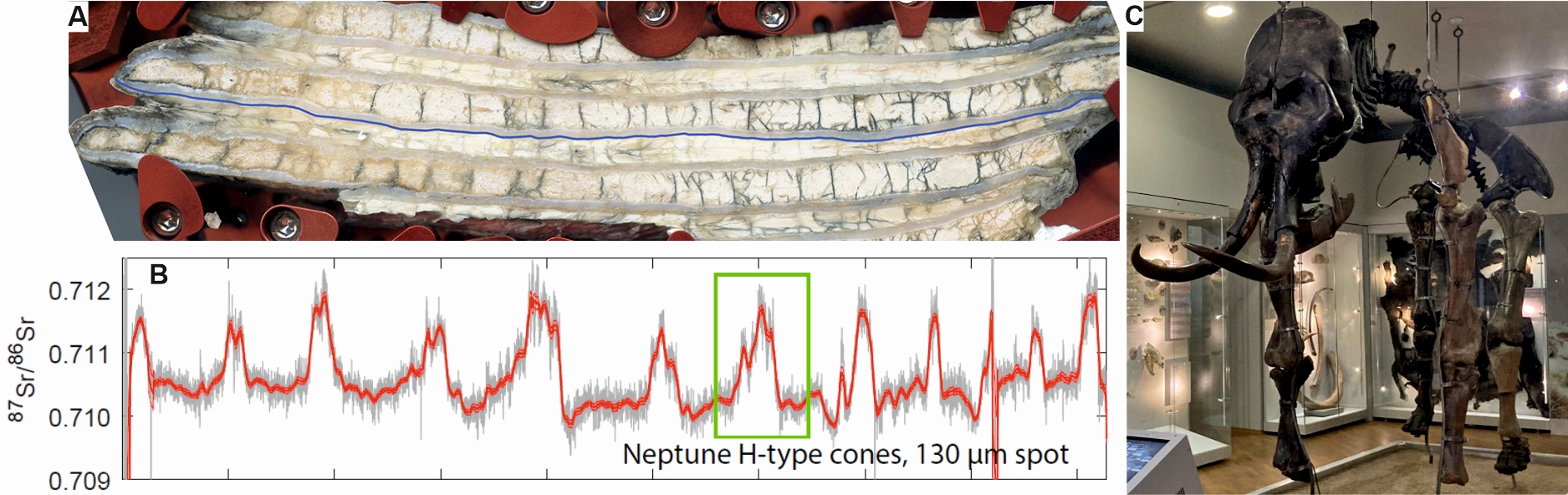 Figure: A – Cross-section of a woolly mammoth molar from Torske, Western Ukraine. The blue line shows the ablation line inside the enamel layer. B – Seasonal changes in 87Sr/86Sr isotope ratios, shown as a smoothed trend (red line) and detailed fluctuations (grey line). C – Mammoth skeleton, assembled from separate elements, on display at the State Museum of Natural History in Lviv.