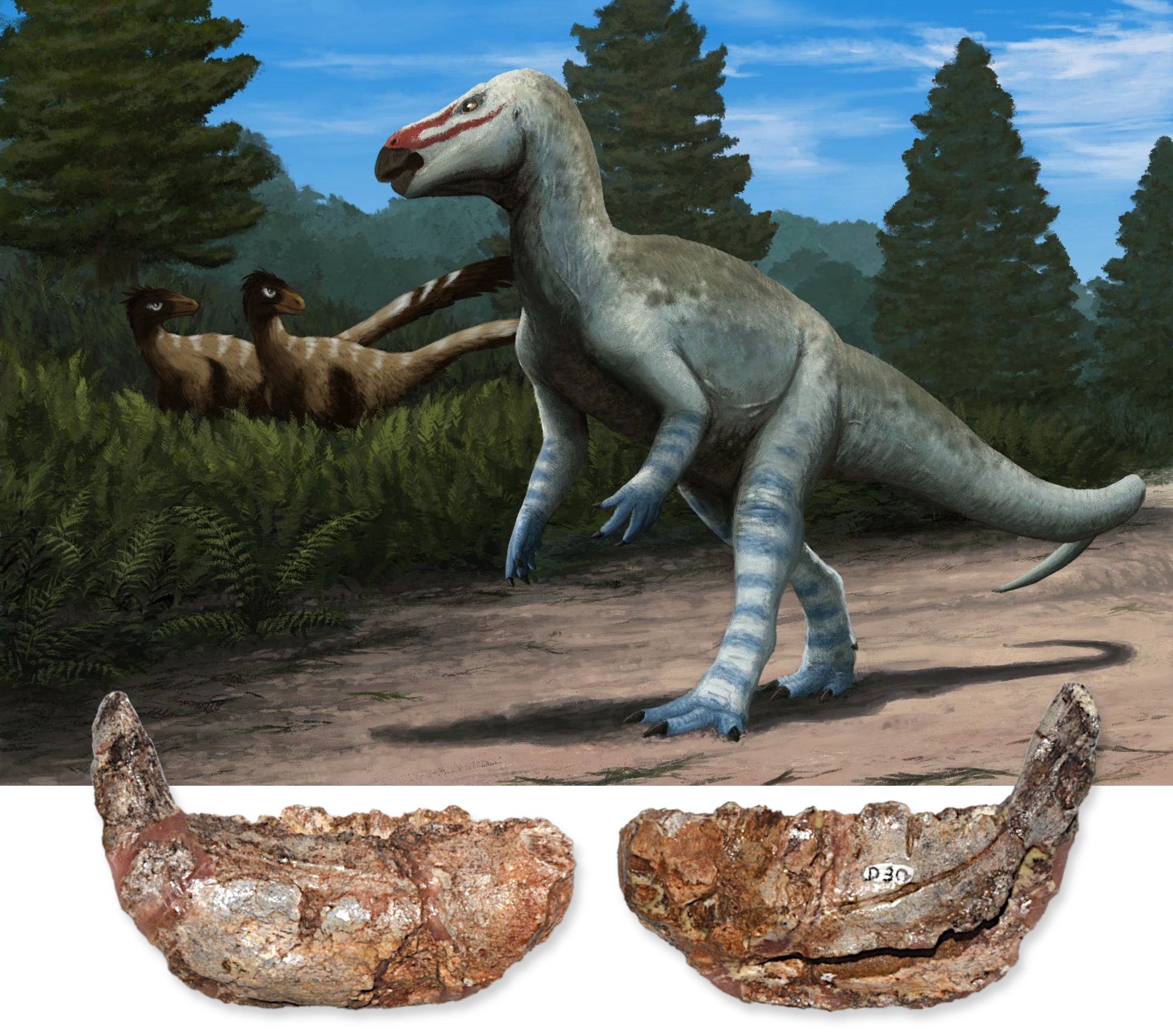 Figure: life restoration of Obelignathus (by Edyta Felcyn-Kowalska) and the described fossil material (dentary bone).