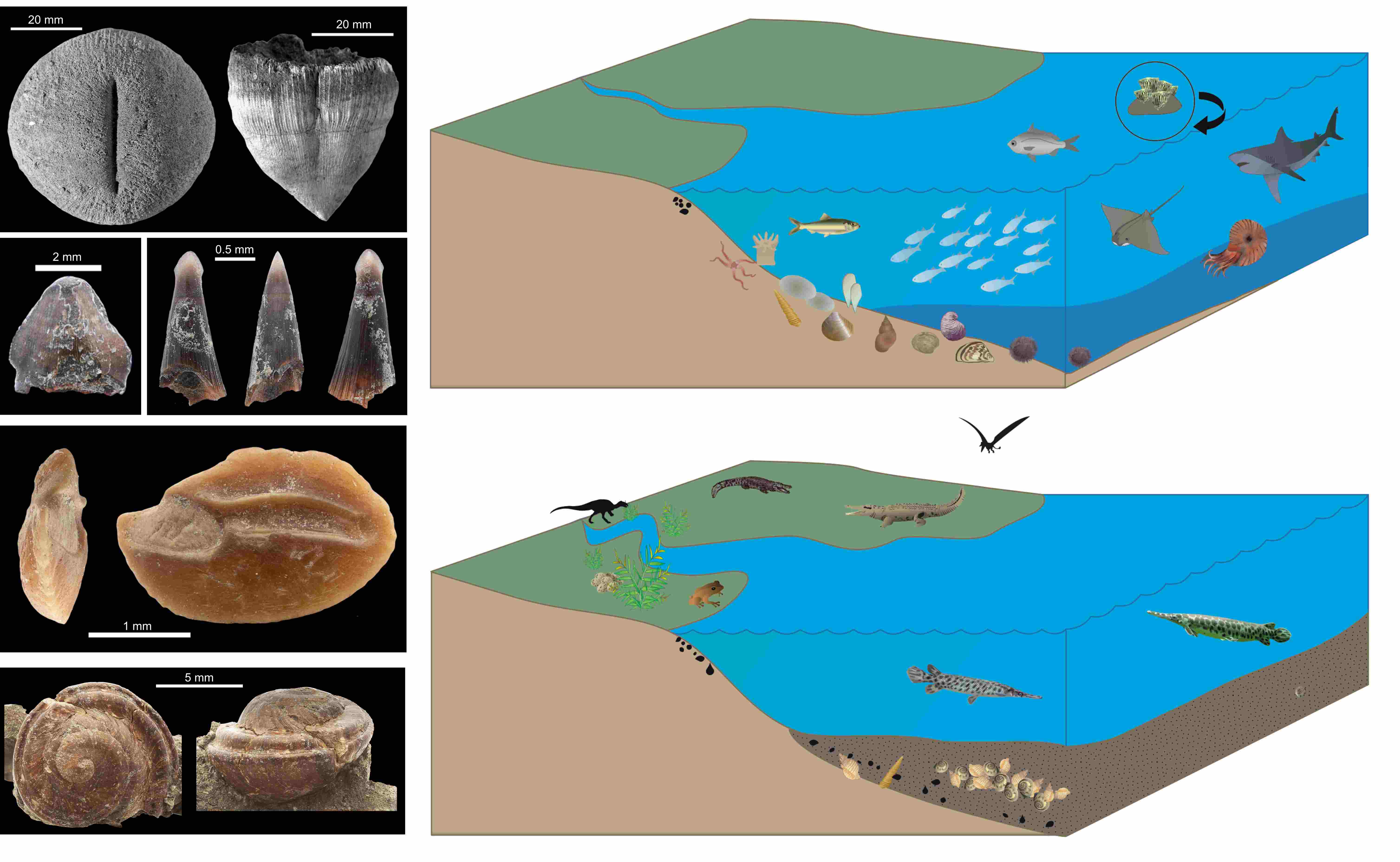 An outcrop in southern Transylvania displays Upper Cretaceous transitional sediments from a marine to brackish environment with terrestrial elements. An international research group (including three members of the Institute of Paleobiology) conducted a comprehensive faunal study of this outcrop and identified 102 taxa of organisms, including nannoplankton, plant seeds and fruits, corals, bivalves, snails, ammonites, sea urchins, starfish, sharks, ray-finned fish, anurans, squamates, crocodiles, and putative dinosaur eggshells.