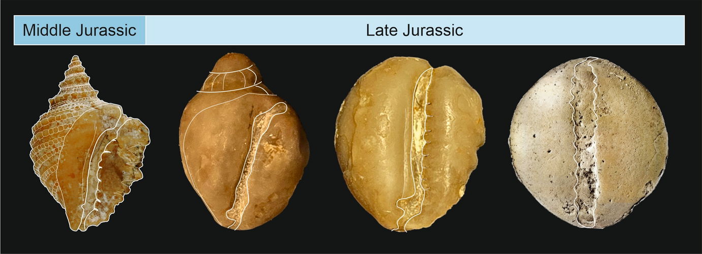 A taxonomic revision of the extinct genus Zittelia from Jurassic sediments made it possible to trace a gradual evolutionary change in shell morphology: from the earliest species with an oval shell and elevated spire to later ones with a more globular form, in which the spire scarcely rises above the last whorl. The morphology of the aperture indicates an affinity of Zittelia with representatives of the cowries (superfamily Cypraeoidea), whose earliest members likewise appeared in the Late Jurassic.