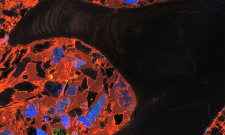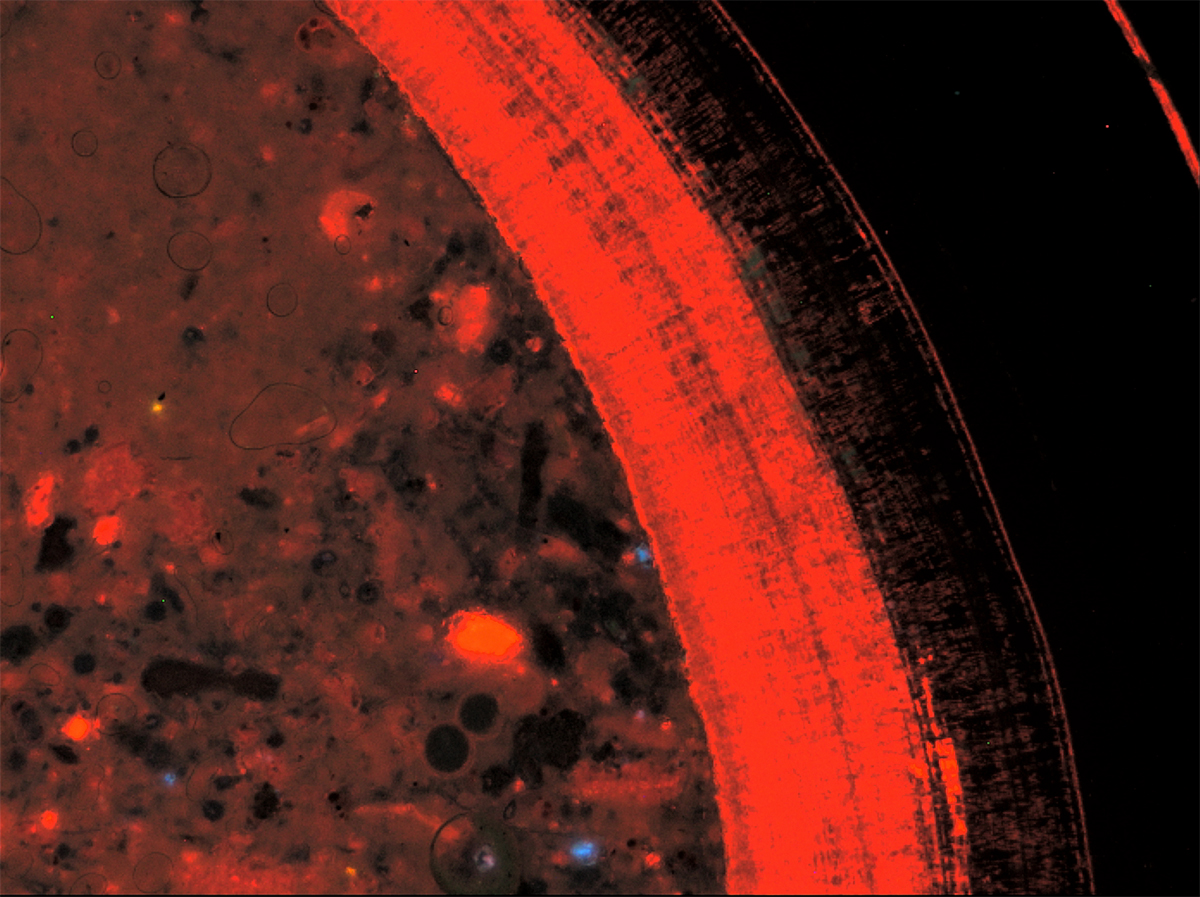 The size of the thin sections should correspond exactly to the dimensions of 27 x 46 mm, i.e. the size of a standard petrographic glass slide, while the thickness of the polished object should not exceed 25 micrometers. In rare cases, depending on the method of preparing the sections and the type of resin used, part of the sample may peel off during the examination, for which the laboratory is not responsible. Visible damage to the cut surface ("burning") may occur during longer observation without changing the position of the examined area, therefore, usually when working in cathodoluminescence mode, the selection of the examined area must be done very quickly (a dozen or so seconds).