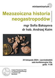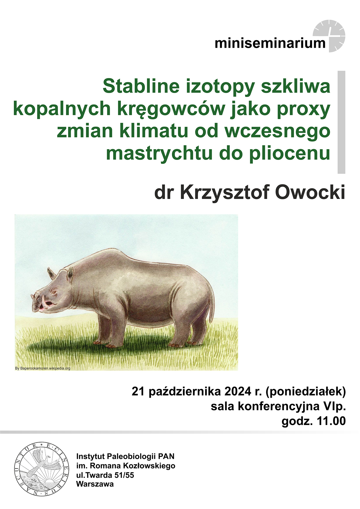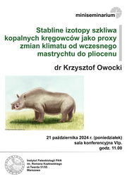 21st October 2024 (Monday), 11:00 a.m., Krzysztof Owocki, Ph.D. will give a seminar: "Stabline izotopy szkliwa kopalnych kręgowców jako proxy zmian klimatu od wczesnego mastrychtu do pliocenu".