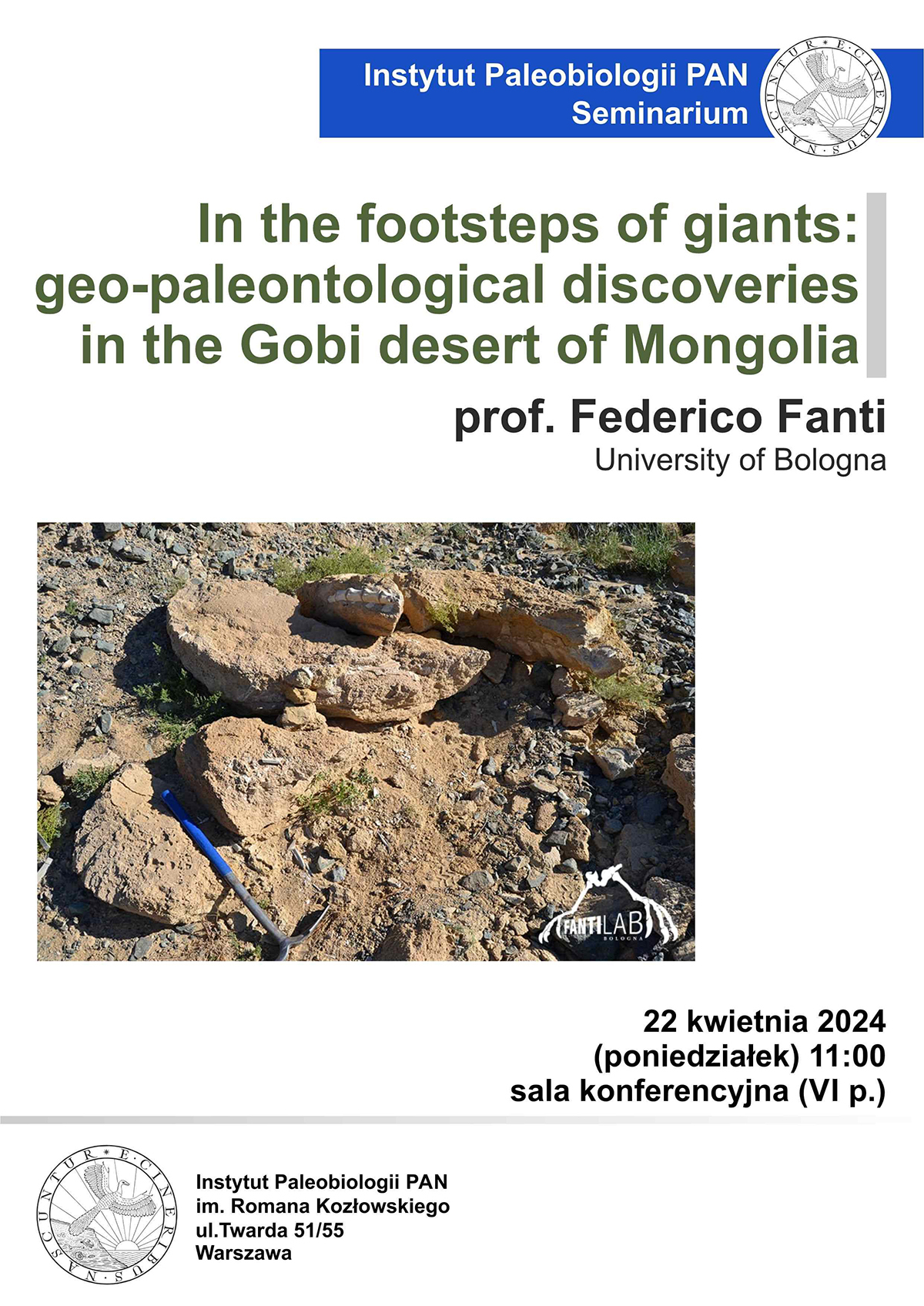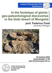 22nd April 2024 r (Monday), 11:00 a.m., prof. Federico Fanti will give a seminar: "In the footsteps of giants: geo-paleontological discoveries in the Gobi desert of Mongolia".