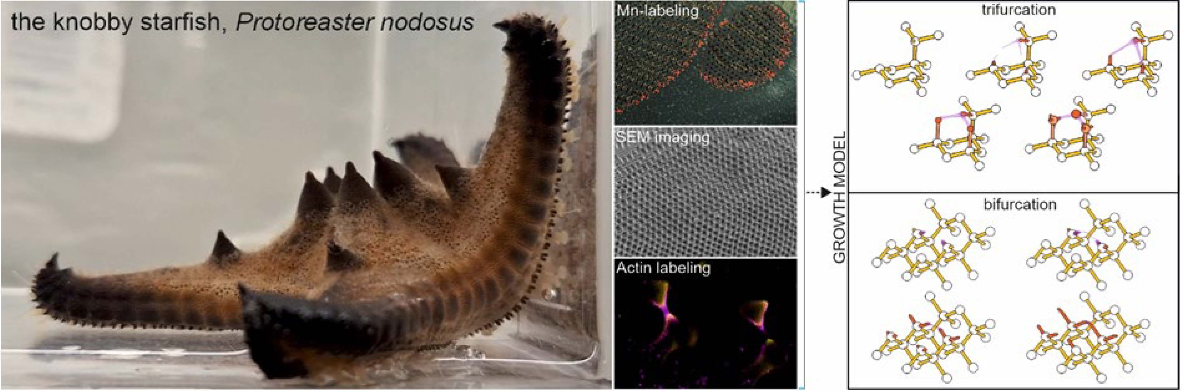 Figure: The horned sea star (left) has a skeleton with a “diamond” microstructure. Using various labeling and imaging techniques (middle panel), a model of stereom growth was proposed (right panel).